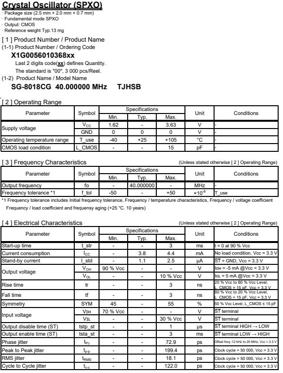 | X1G005601036800 | SG-8018CG | 40.000000 MHz | 2.50 x 2.00 x 0.80 mm | CMOS | 1.620 to 3.630 V | -40 to 105 °C | +/-50 ppm | ≤ 4.4 mA |