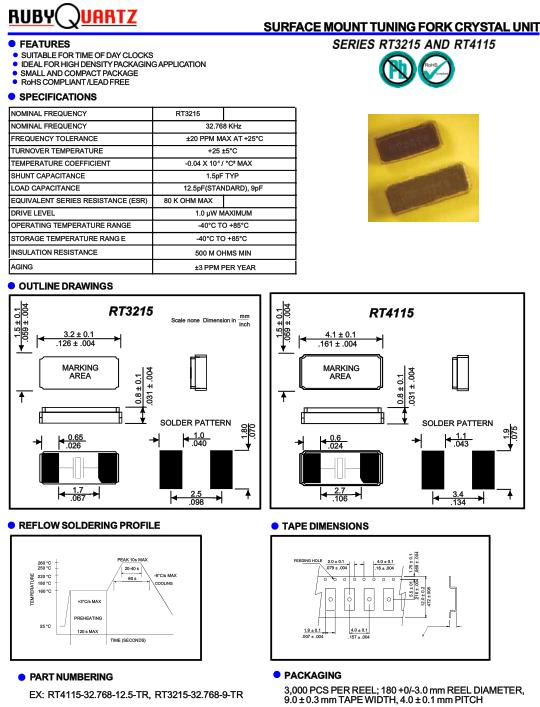 Rubyquartz晶振-Rubyquartz Crystal是領先的頻率元件供應商之一,主要提供市場盧柏貼片晶振,有源晶振,溫補晶振,石英晶體等產品.Rubyquartz晶振,RT3215晶振,RT3215-32.768-9-TR晶振.